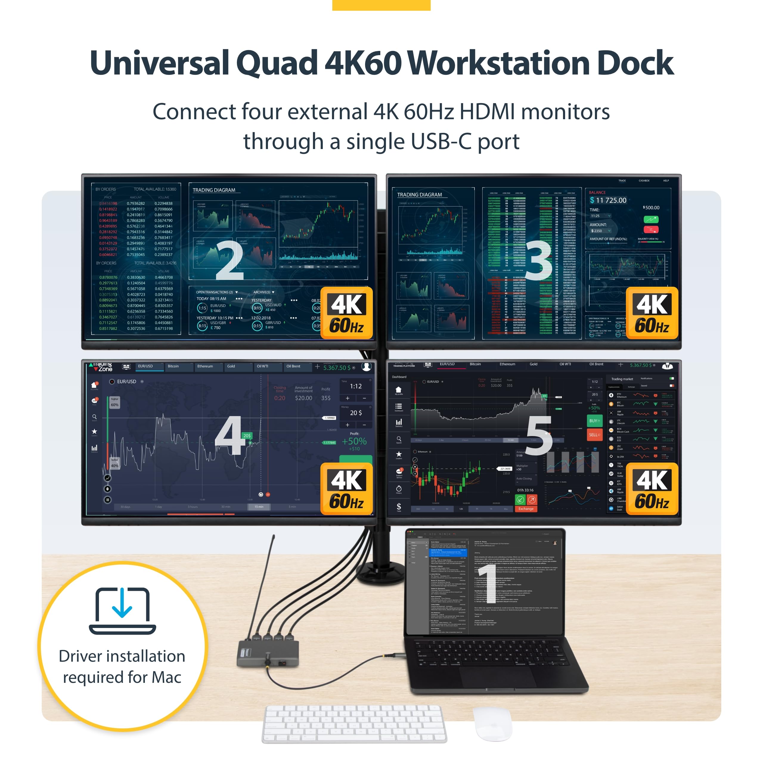 - QUAD 4K60 WORKSTATION ADAPTER: Transform your laptop into a productivity workstation by connecting four 4K 60Hz HDMI monitors while charging your laptop and connecting a wireless mouse or keyboard dongle, all through a single USB-C host connection